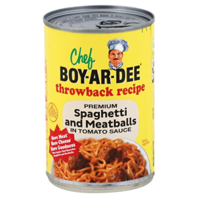 Spaghetti & Meatballs Can | Chef Boyardee Spaghetti & Meatballs Can, 3.3, (129) Write a review, Enjoy the Chef's famous-recipe pasta and meatballs in a signature tomato sauce. See ingredients, nutrition, and other product information here, Buy Now, Tell your friends: You May Also Like, Pizza Sauce with Cheese, (29) Overstuffed Beef Ravioli Can, (55)