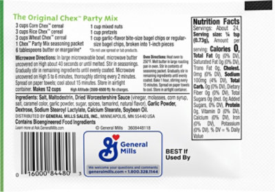 › recipes › the-original-chex-party-mixOriginal Chex™ Party Mix (1/2 Batch) 1 tablespoon Worcestershire sauce; 3/4 teaspoon seasoned salt; 1/4 teaspoon garlic powder; 1/4 teaspoon onion powder; 1 1/2 cups Corn Chex™ cereal; 1 1/2 cups Rice Chex™ cereal; 1 1/2 cups Wheat Chex™ cereal; 1/2 cup mixed nuts; 1/2 cup bite-size pretzels; 1/2 cup garlic-flavor bite-size bagel chips or regular-size bagel chips, broken ...