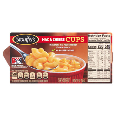 PDF Macaroni & Cheese Nutrition Facts - Dotdash Meredith It is important to pay attention to the serving size, including how many servings there are in the food package. Compare the serving size to how much you actually eat. The size of the serving on the food package impacts all the nutrient amounts listed on the top part of the label. One serving of macaroni and cheese equals one cup.