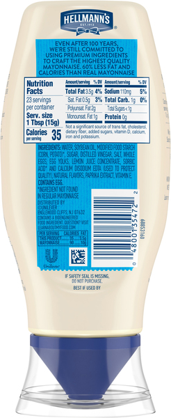 Hellmans nutrition label. Hellmann's, Real Mayonnaise - SmartLabel™ - Unilever May 24, 2022 ... Nutrition Facts · Calories 90 · % Daily Value * · Total Fat 10 g 13% · Saturated Fat 1.5 g 8% · Trans Fat 0 g · Polyunsaturated Fat 6 g ... Carbs in Hellmann's Real Mayonnaise Nutritional Facts · Calories. 1579.6 kCal · Total Carbs. 7 g. Net Carbs. 7 g. Fiber. 0 g. Starch. -. Sugar. 2.4 g. Sugar Alcohols. - · Protein. 2 g · Fat. 174.7 g. Hellmann's Real Mayonnaise - Shop Condiments at H-E-B Hellmann's Real Mayonnaise ; Cholesterol, 5mg, 2% ; Sodium, 90mg, 4% ; Total Carbohydrate, 0g ; Protein, 0g ... Mayonnaise by HELLMANN'S nutrition facts and analysis. Mayonnaise by HELLMANN'S nutrition facts and analysis per 1 tbsp (15.0 ml) aprx (15.0 g) ; Minerals · Sodium, 90.00 mg, 4 % ; Proteins and Aminoacids · Protein ...