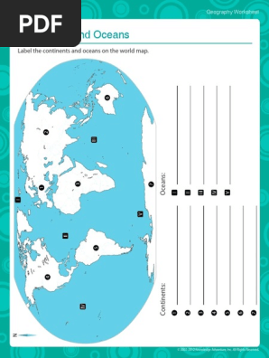 continents-and-oceans.pdf - Education World Geography Worksheet. © 2007-2012 Knowledge Adventure, Inc. All Rights Reserved. Continents and Oceans. Label the continents and oceans on the world map.