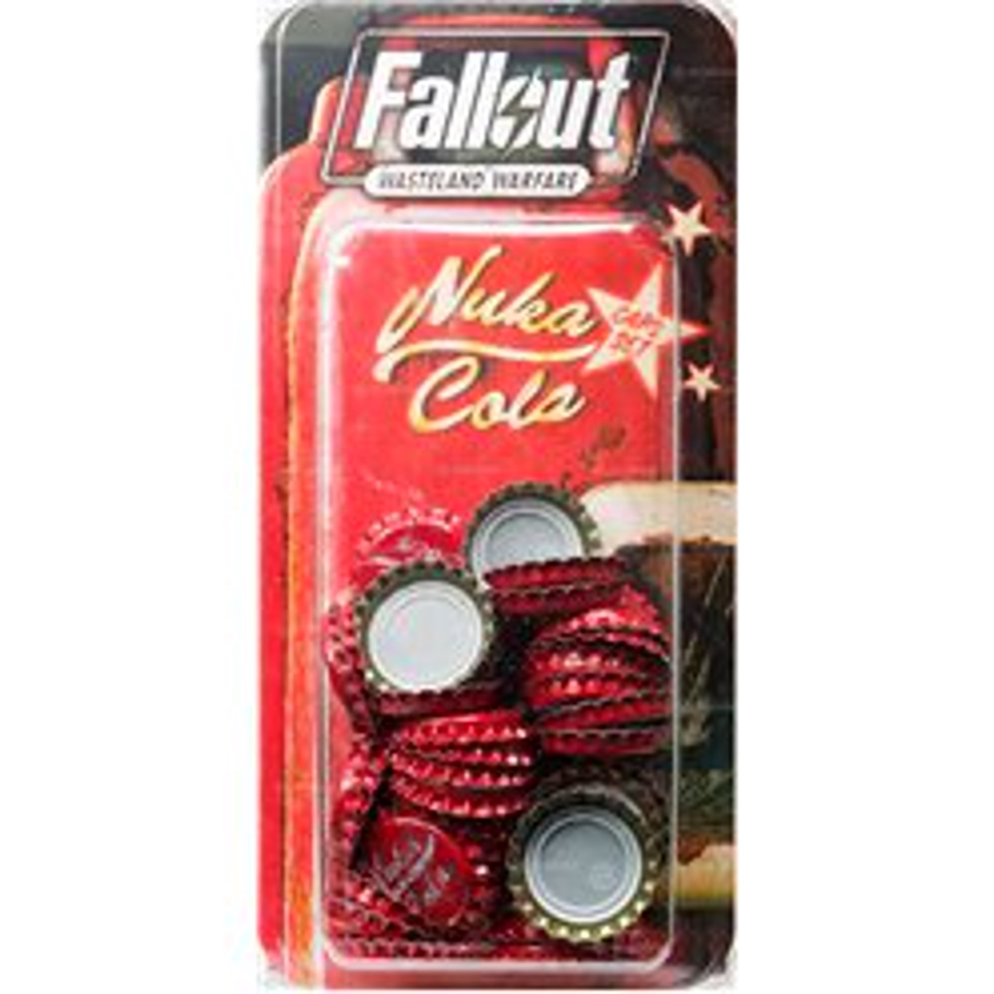 Modiphius Fallout Nuka-Cola Caps set (50 caps) - amazon.com This is a set of 50 distressed Nuka-Cola bottle caps made by an official bottle cap manufacturer with an approved graphic design to resemble authentic Nuka-Cola caps! There is also an exclusive weapon card for use in your game of Fallout: Wasteland Warfare, the Bottle Cap Mine.